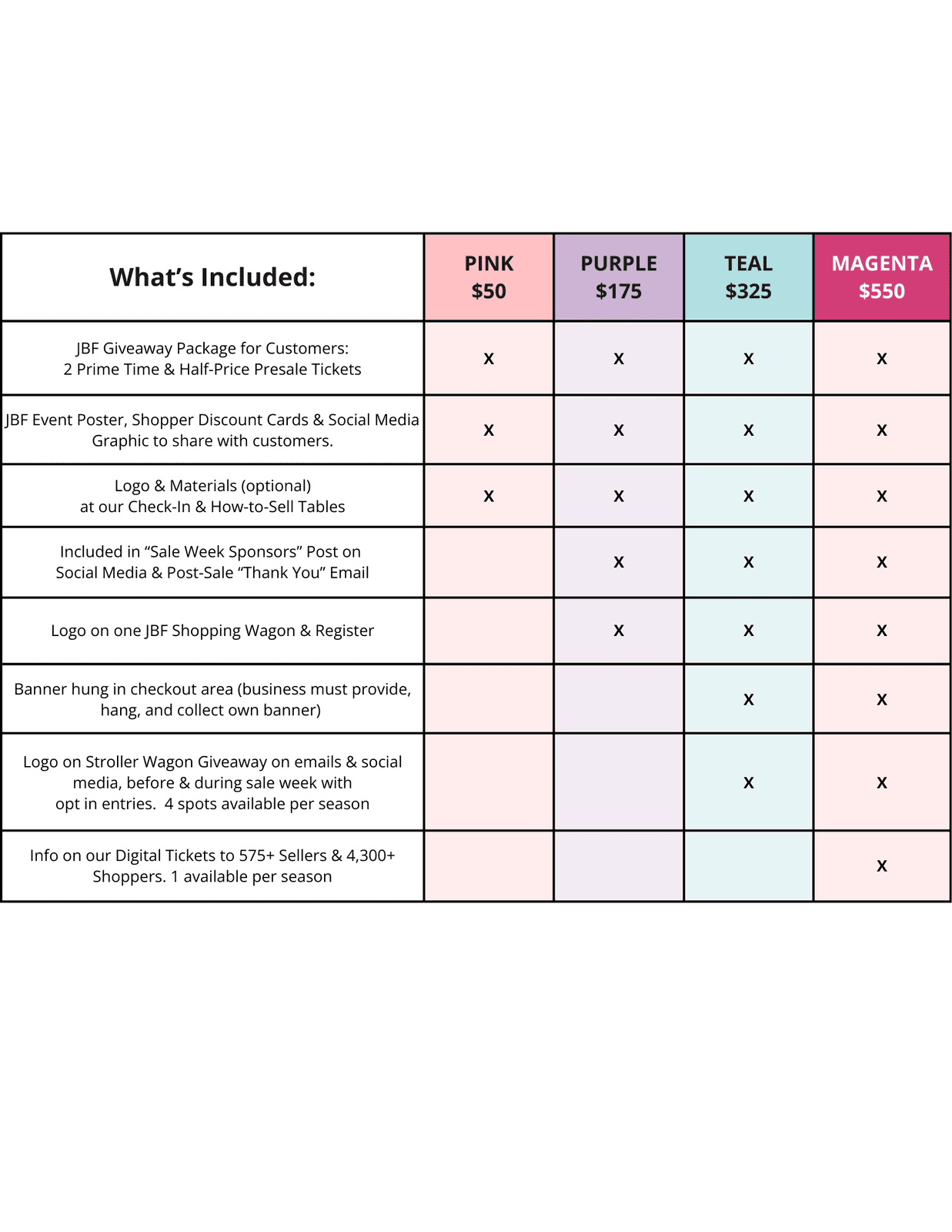 Sponsorships give you the opportunity to put your local business in front of our specific target group of families, caregivers, teachers, and expectant families throughout Spring, Tomball, Cypress and surrounding Houston communities. JBF is unique in the way we hyper-focus our marketing online and in-person to reach families in the communities we also reside in.